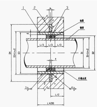 4 、套管穿墻處之墻壁,如遇非混凝土墻壁時應改用混凝土墻壁,其澆注混凝土范圍,Ⅱ型套管應比翼環直徑(D4 )大200mm ,而且必須將套管一次澆固于墻內。套管內的填料應緊密搗實。